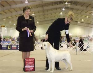 Sire: “Tru”: CH Belquest Junk In The Trunk “Tru” is a son of the world-famous CH Borador By George more famously known by his call name of “Gordy”. When visitors came to look at one of our dogs, they always gravitated to Tru. He had a magnificent build, English from his head to the tip of his thick otter’s tail. He had a presence about him, and very poised, but friendly. Tru was simply “Amazing”!