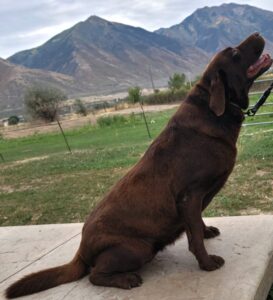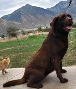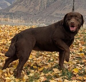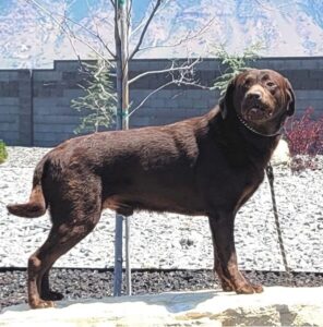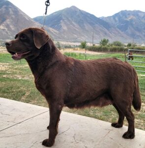 Sire: “Tango”: We couldn’t wish for anything more. Tango has matured, blossoming into a stunningly handsome chocolate English Lab. He has a wide forehead, a long attractive neck, and a muscular stout body, and a thick otter tail, typical of the Labrador Retriever breed. He even has a great personality. Tango is a son of CH Cedarwood Signatures Otter By Design and our girl, Gold Rush Luck of The River. We know that Tango will pass on his many fine traits/genes to his offspring. We are so excited to have him!!!