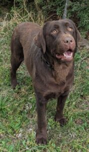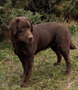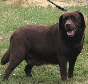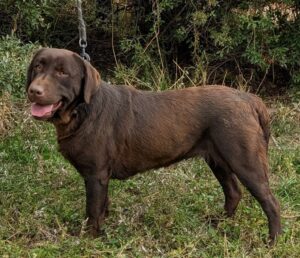 Dam: “C C”: “CC” is our newcomer here at Woodland Hills Retrievers. She has already earned her UKC Championship in Conformation, meaning that she has a very her correct English build. However, her greatest asset is her sparkling, friendly personality. She is a gorgeous chocolate, daughter of UKC CH Edlen House Fabulous Wealth, “Cash”, NatCH, IntCH, from Russia. Yes, CC brings with her new bloodlines from overseas. CC’s mother, Wise Acres Coco Calypso is from the USA, has also has some famous names in her pedigree. We are so excited to have CC here with us. DOB: 10/16/23, OFA Hips “Good”, OFA Elbows “Normal”, Eyes: Clear, Cardiac: Normal